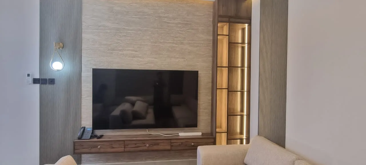 - إضافة إضاءة خلفية خافتة خلف التلفزيون لإضفاء جو مريح.