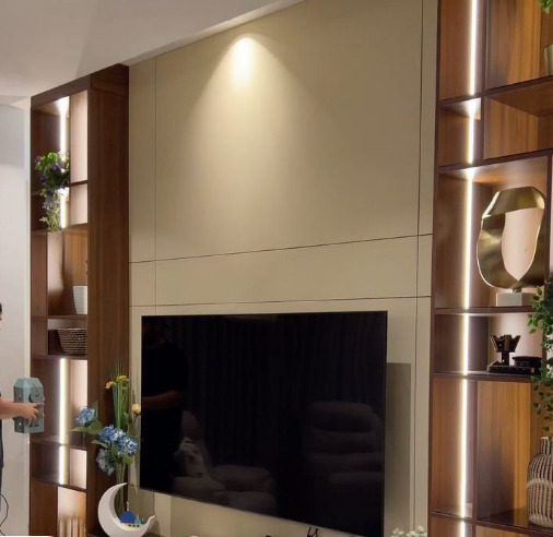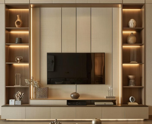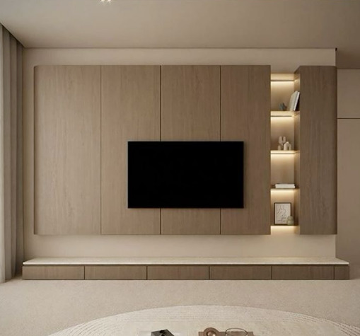 رفوف وخانات حائطية: يمكن استخدام الأرفف لتخزين الكتب والقطع الفنية، مما يساهم في ترتيب الفراغ حول الشاشة التلفزيونية.
