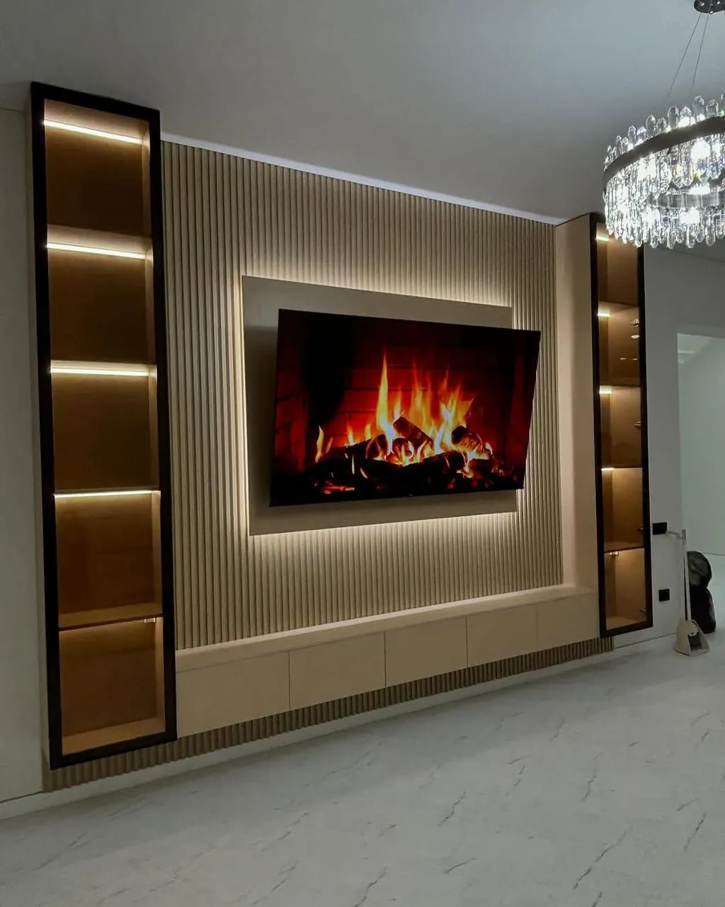 - ديكور شاشة 65 بوصة: العرض 180 سم × الارتفاع 130 سم.