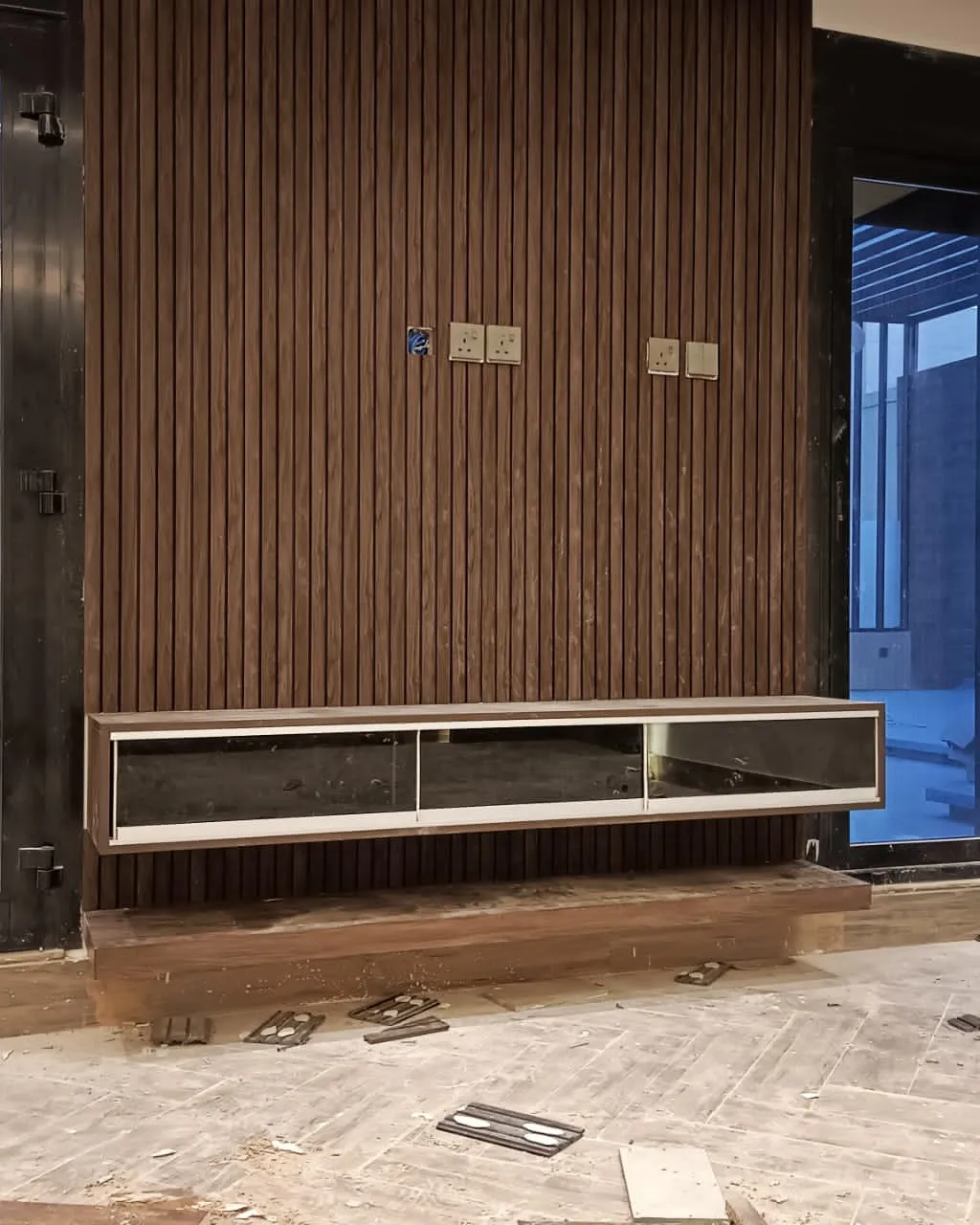 - إذا كنت ترغب في إضافة لمسات خشبية دافئة، يمكنك دمج الخشب الطبيعي في الديكور، مثل الوحدات التحكم أو الرفوف المحيطة بالتلفزيون.